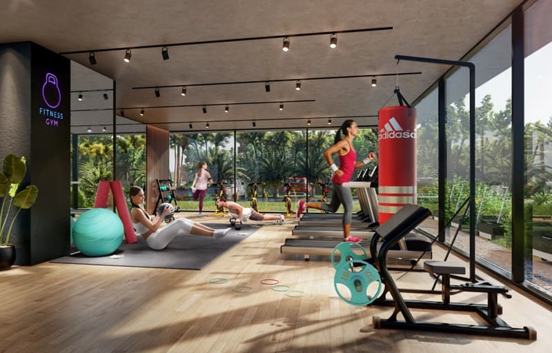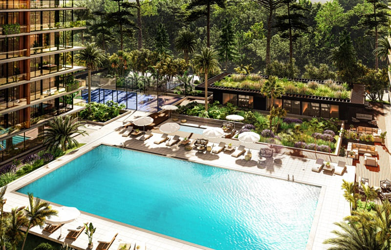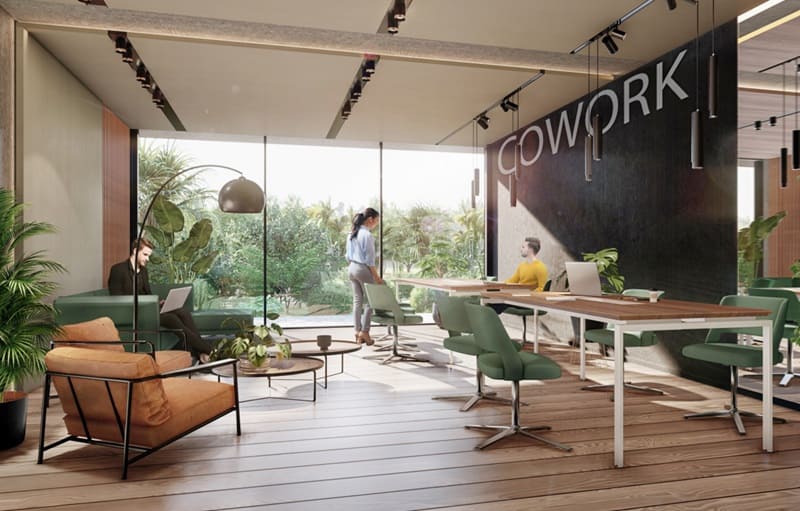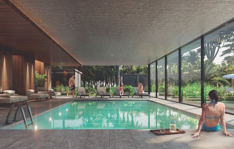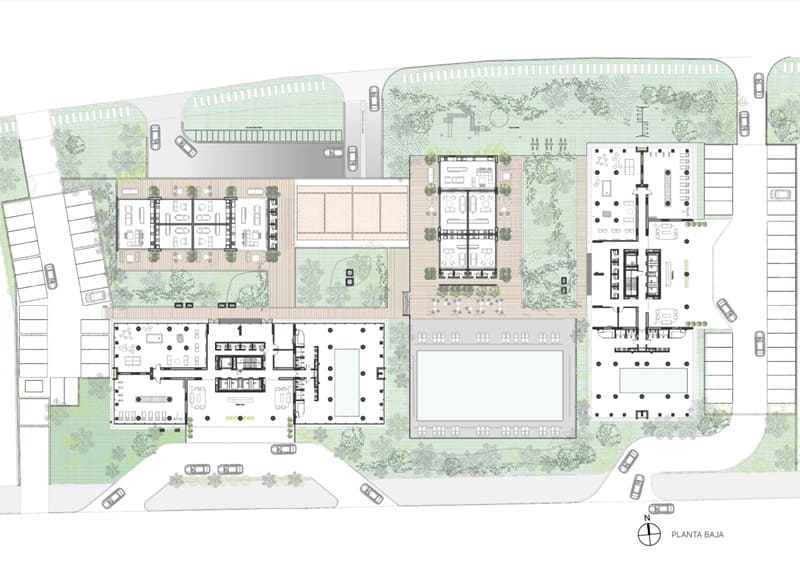 - Donde contarán con servicios individuales en cada torre, como por ejemplo piscina interior climatizada, gimnasio, espacio de cowork, saunas, recepción 24 hs; los servicios exteriores de piscina, 11 barbacoas y cancha de usos múltiples será compartida